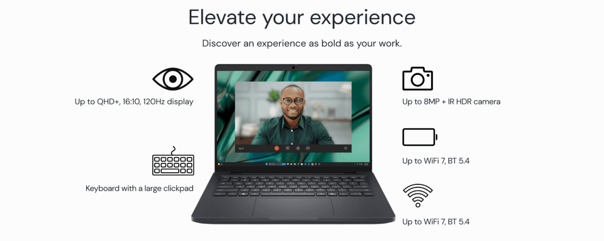 14″ FHD+ LCD with 300 nits, Non-touch, FHD HDR IR Camera, Microphone, WLAN